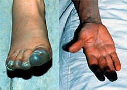 Erfrierungen beginnen mit eigentümlichen Symptomen. Zuerst hat man beim Anfassen Schmerzen an den äusseren Körperteilen; danach verschwinden alle Gefühle und der erfrorene Körperteil fühlt sich wie betäubt an. Die Hautfarbe verändert sich, wird erst rötlich oder verblasst, bis man Blasen bekommt und die Haut schwarz wird.