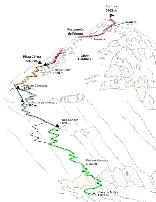 La voie normale de l’Aconcagua est le chemin le plus simple qu’offre le massif pour l’ascension Aconcagua. On la nomme parfois à tort route Nord alors qu’en fait elle est plutôt Nord-Ouest. Habituellement il n’y a besoin ni de piolet ni de cordes, sinon pour commodité et utilité, de bâtons télescopiques. Si certes il n’y a pas d’installation d’eau, près des camps se trouvent de grands névés dont on fait fondre des morceaux pour obtenir de l’eau. En montant par cette voie, il y a trois itinéraires connus, mais le plus usuel est de gravir jusqu’à deux ou trois camps d’altitude avant le sommet (Camp 1 Plaza Canadá, Camp 2 Nido de Cóndores et ).
